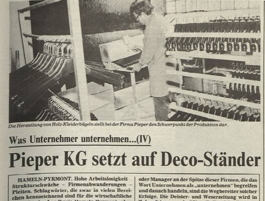 - 1987 hat die Pieper KG 75 Mitarbeiter - 15 mehr als im Jahr zuvor. Neben den Kleiderbügeln sind auch Dekorationsständer für den Einzelhandeln im Sortiment.